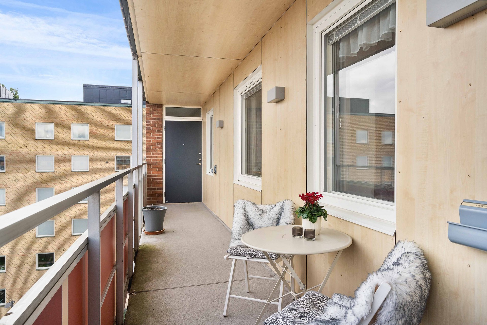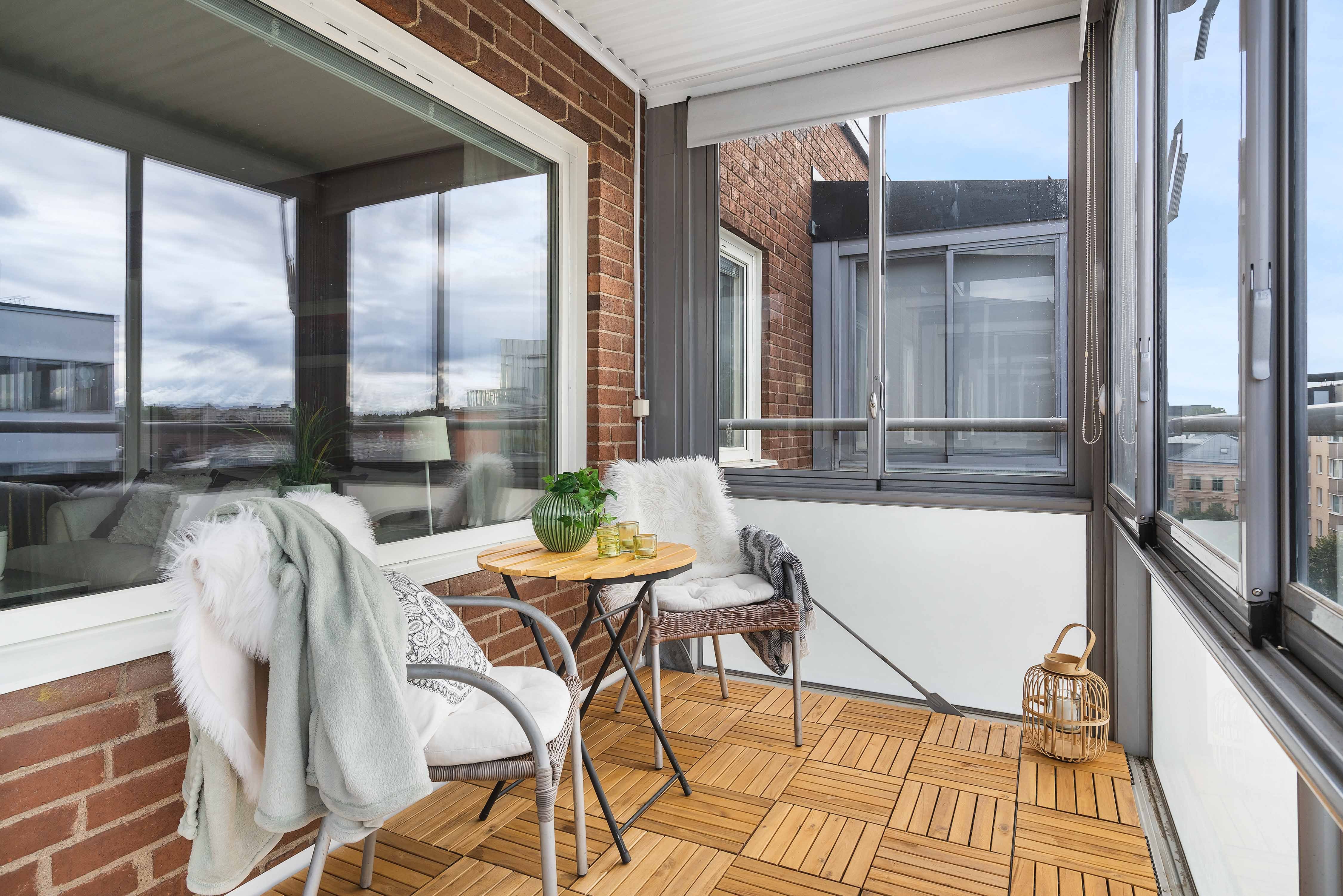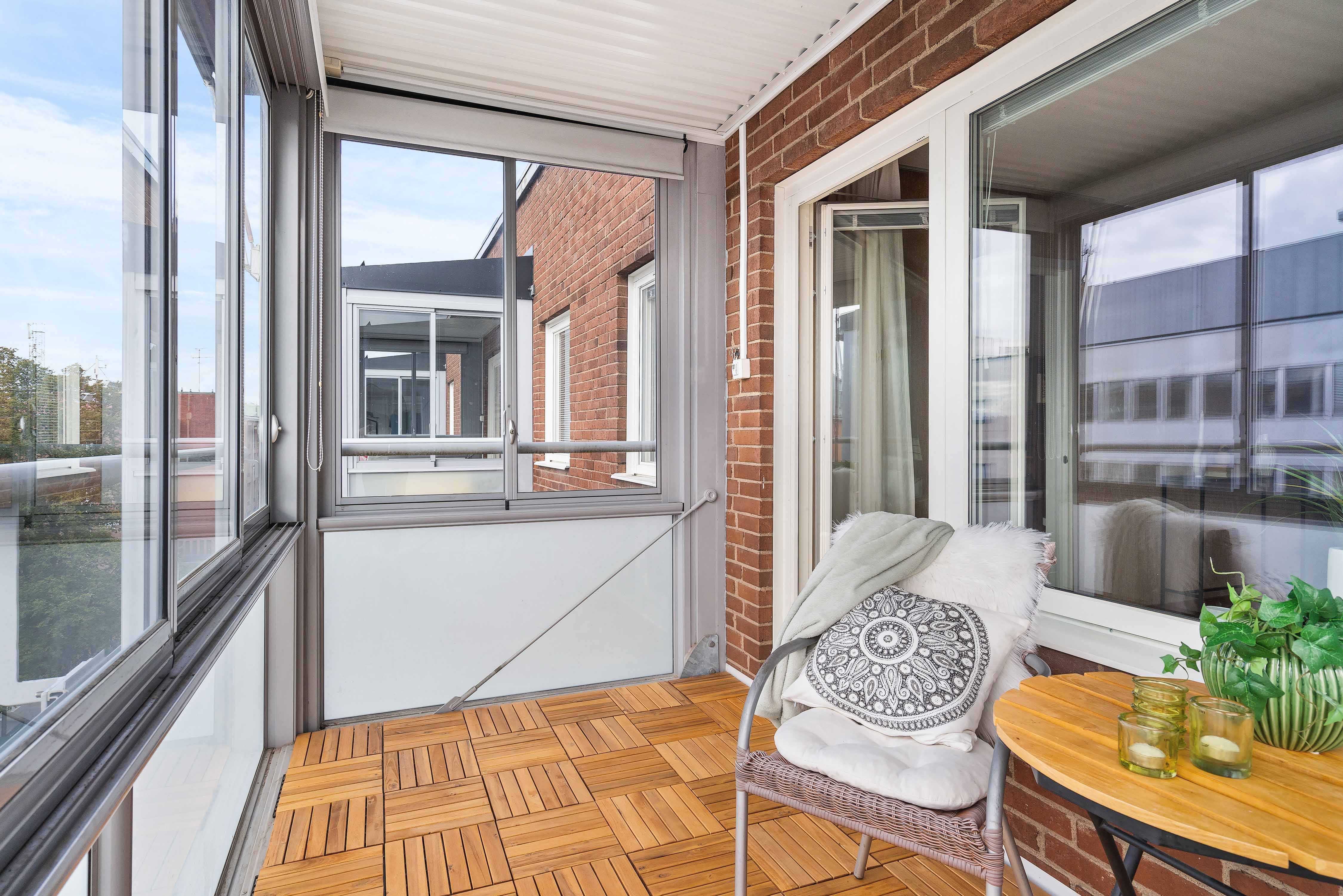 Utöver balkongen kan du även njuta av morgonkaffet på den möblerbara loftgången som vetter mot den lugna innergården.