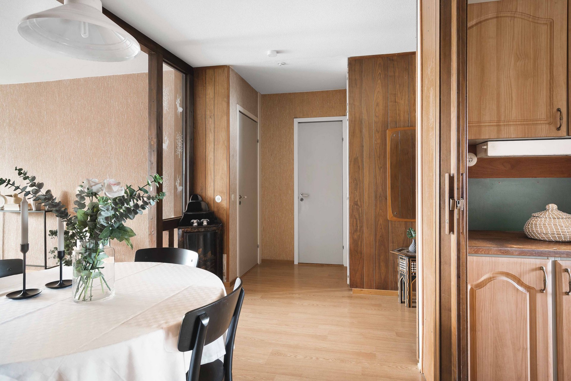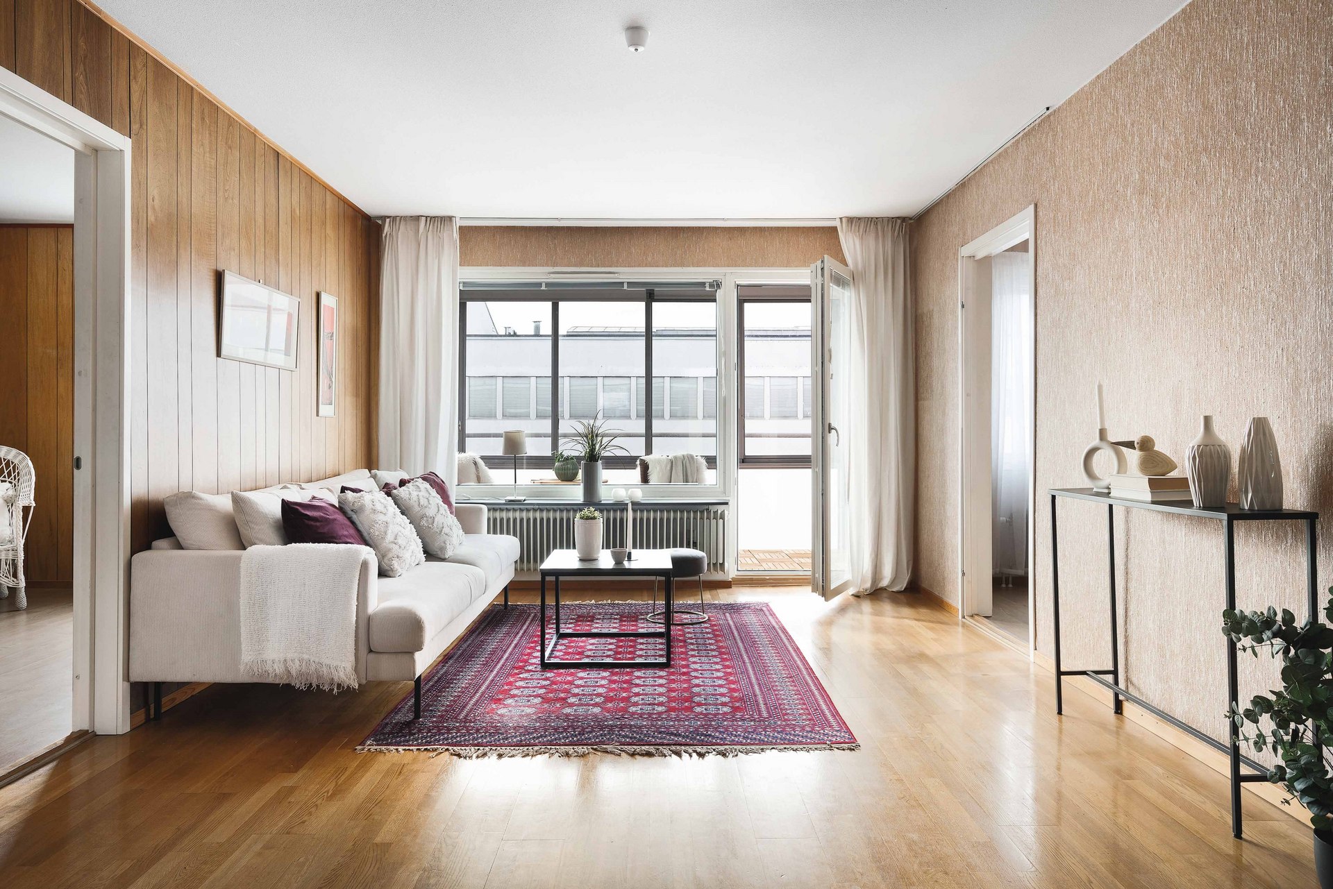 Bostadens yta bjuder på gott om utrymme för socialt umgänge. Här finns en hall med plats för ytterkläder, ett funktionellt arbetskök med matplats utanför som ligger i öppen anslutning till det stora vardagsrummet – perfekt för måltider både vardag och fest. Vardagsrummets stora fönsterparti ger fint ljusinsläpp och härifrån når du den inglasade balkongen, där många soltimmar kan avnjutas.